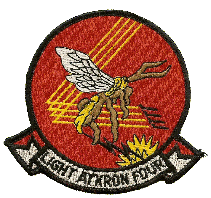 The Squadron's Original Yellow Jacket Patch Was Approved By The CNO On March 7, 1969. The Insignia Depicted A North American Predatory "Yellow Jacket" Wasp With Silver Wings Stinging An Exploding Target With A Lightning Bolt From It's Stinger. The Wasp Was Placed Over Four Black Stylized Aircraft With Yellow Contrails On A Red Background. The White Underlying Scroll Enclosed The Words "Light Atkron Four" In Black Lettering.