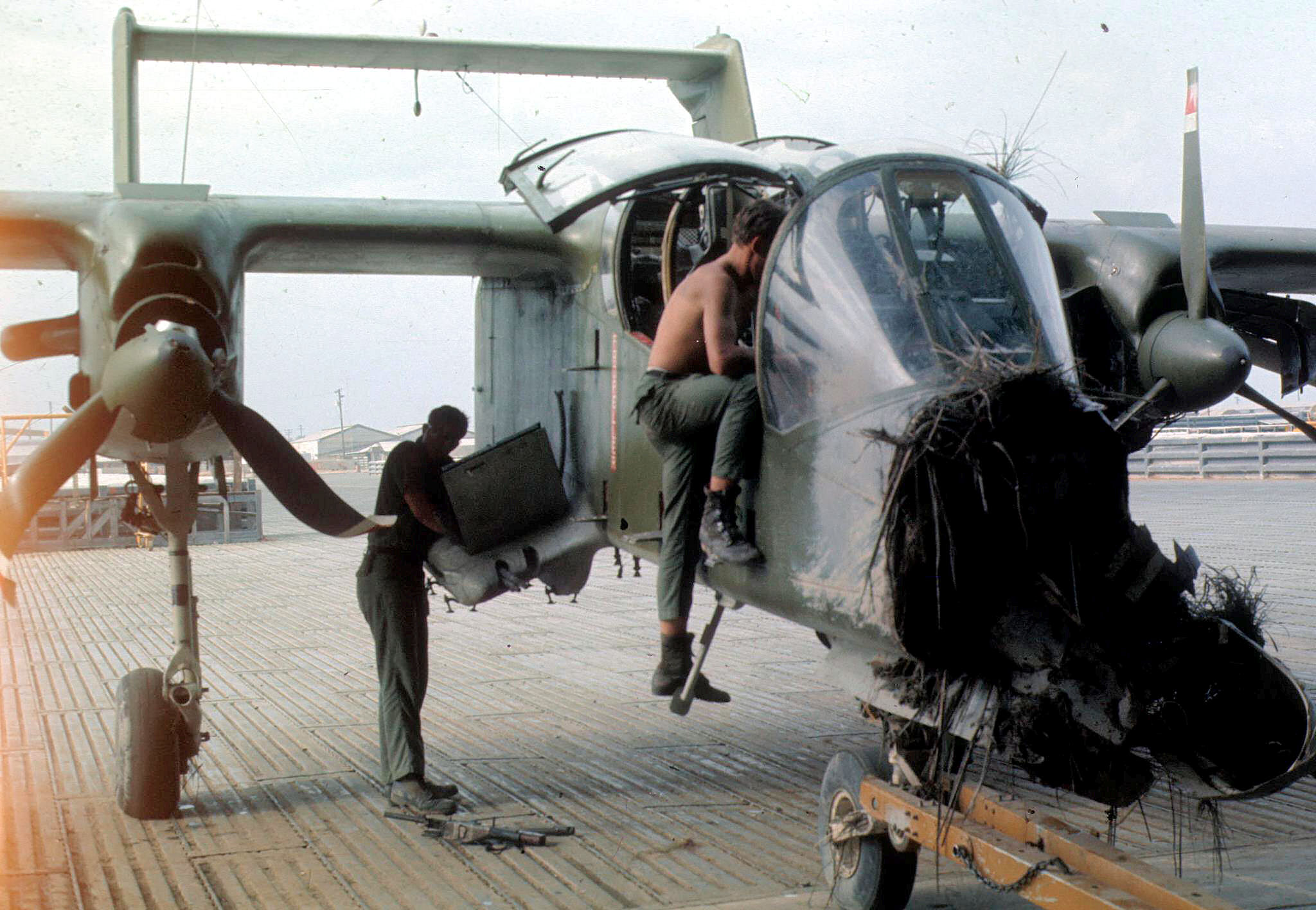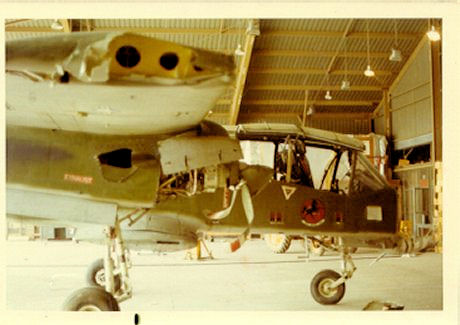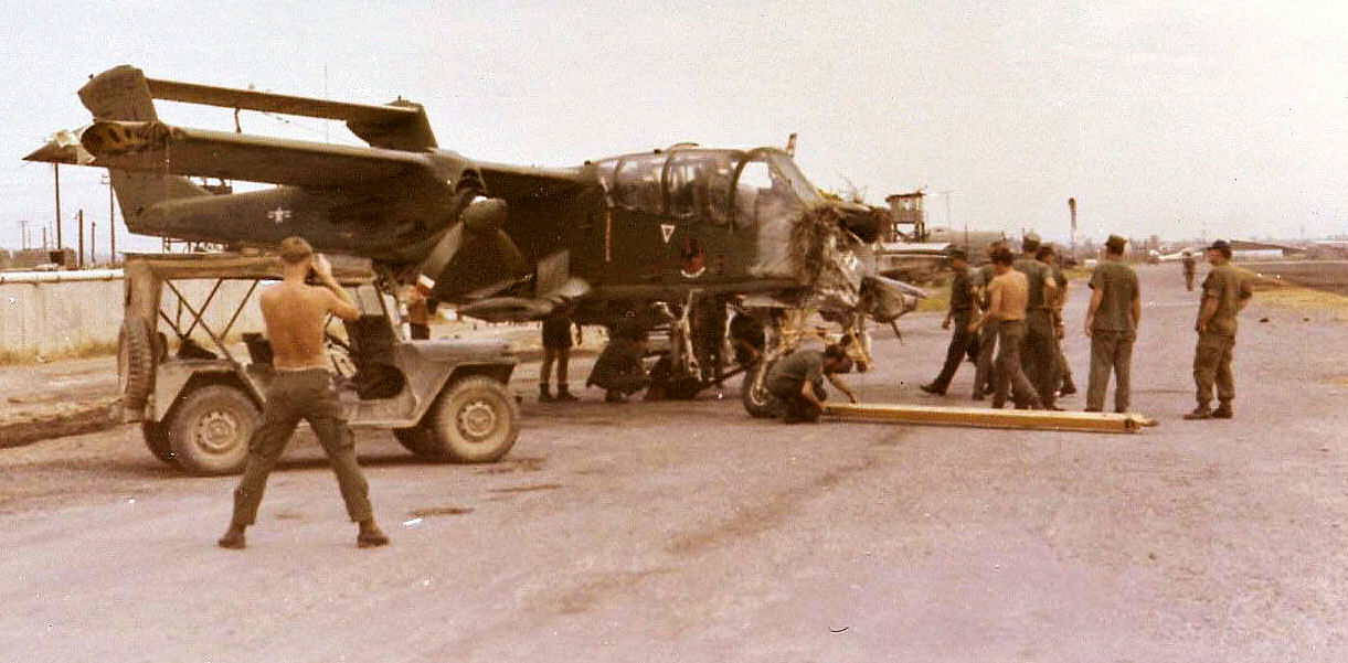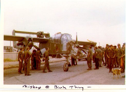 I immediately considered dropping all of my ordinance to lighten our load but there was a small Vietnamese village below us and I couldn't drop it there. I continued losing altitude and as I reached the end of the runway I was now over a burning dump and again thought that might be a poor place to put all those rockets. So I kept full power on both engines and just barely made the 180 degree turn on to the runway. I got the plane lined up with the runway with just a few feet of altitude left and dropped the landing gear. I actually landed with my throttles at full power on both engines but apparently the left engine was just seconds away from full failure. So when I pulled the throttles back into reverse the left engine failed and the right went into full reverse. On the wet runway this imbalance in thrust immediately turned us to the right and our near 100MPH foreword speed propelled us off the runway. I pulled the right engine out of reverse thrust but by the time I reacted we were already on a really bad Bronco ride through the elephant grass. This quickly came to an end when the front wheel went into a canal which caused the airplane to stand on its nose for a second before falling back down onto the mains. When it went up on its nose the nose collapsed leaving me looking at water and elephant grass just a couple of feet away from my face. All the while I was hoping that Lynn would ride it out with me and not eject. He did including the last few seconds of the ride which if we had ejected then, we would have shot ourselves right into the swamp. The aircraft had just barely settled back down when as I reached to shut off all of the ordinance and the electricity, Lynn was already outside yelling at me to get the F... Out! We sloshed the 25 yards back to the runway through the rain and elephant grass. Sadly looking back on a still smoldering wreck.