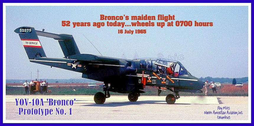 In August 1964 the North American Aviation Model 300 was selected and a contract for seven prototype aircraft was issued in October. Nine month's later the maiden flight of the YOV-10A 'Bronco' took place on July 16, 1965. In 1966, North American Aviation was awarded contracts to build 271 OV-10As - 114 for the USMC and 157 for the USAF. Shortly after North American Aviation and Rockwell Collins merged in March 1967 the first flight of the OV-10A production model took place in August of 1967.