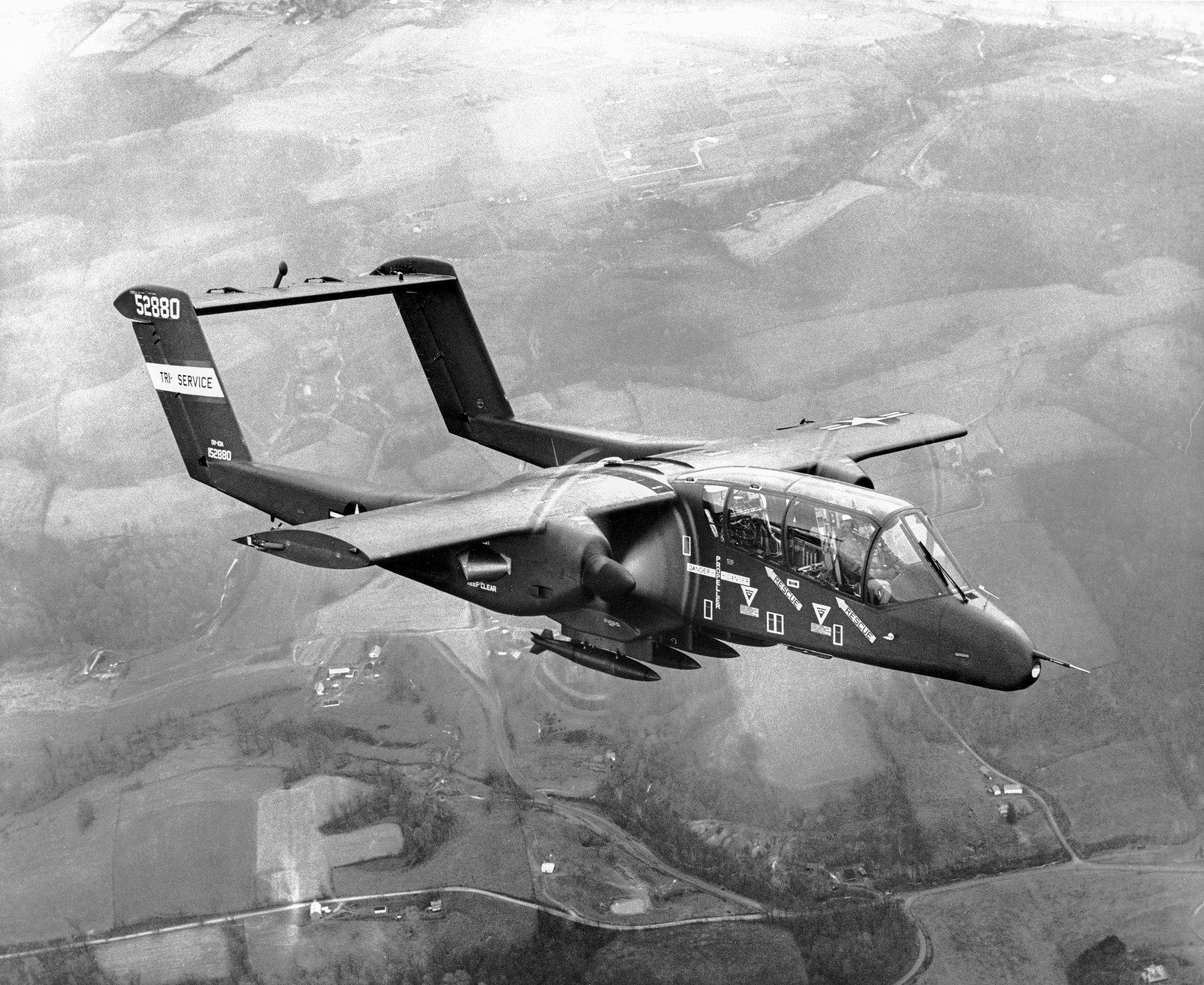 The pilot and co-pilot sat in tandem in a full-windowed "greenhouse-style" cockpit with generally great visibility from any direction but to the rear. The cockpit was positioned as such that forward seat was held out well past the engines themselves. Both cockpit positions were afforded ejection seats for improved crew survivability ( helped along by the Broncos inherently rugged design and construction). The fuselage nacelle featured a cabin area at rear with space for could fit two medical litters and one medical attendant or five combat-ready infantrymen. Up to 3,200lbs of supplies could also be taken aboard if need be.
