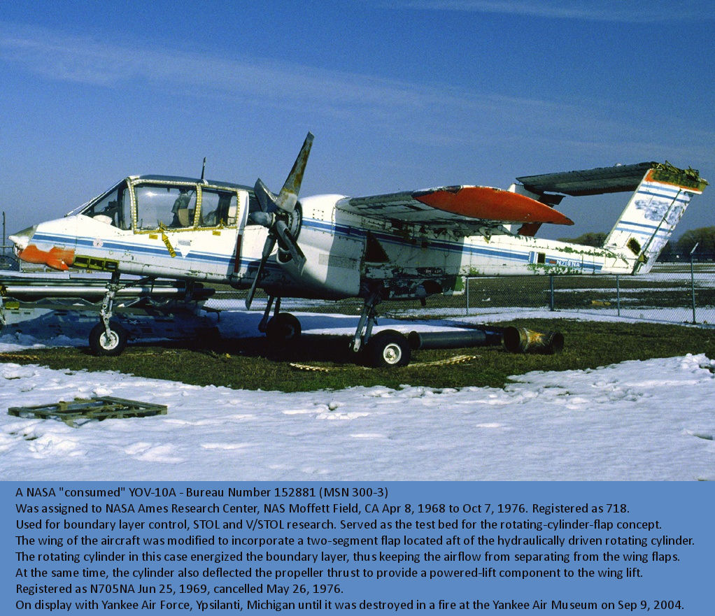 152881 (MSN 300-3) First listed at the North American Factory in Columbus, Ohio on January 27, 1967. Transfered to All Service Test & Evaluation at NAS Patuxent River, Maryland on August 28, 1967. Assigned to NASA on March 29, 1968. Next listed at NASA's Ames Research Center, NAS Moffett Field, CA Apr 8, 1968 to Oct 7, 1976. Registered as 718. Used for boundary layer control, STOL and V/STOL research. Served as the test bed for the rotating-cylinder-flap concept. The wing of the aircraft was modified to incorporate a two-segment flap located aft of the hydraulically driven rotating cylinder. The rotating cylinder in this case energized the boundary layer, thus keeping the airflow from separating from the wing flaps. At the same time, the cylinder also deflected the propeller thrust to provide a powered-lift component to the wing lift. Registered as N718NA Jun 25, 1969, cancelled May 26, 1976. Was with Yankee Air Force, Ypsilanti, Michigan. Destroyed in fire at the Yankee Air Museum on October 9, 2004.
